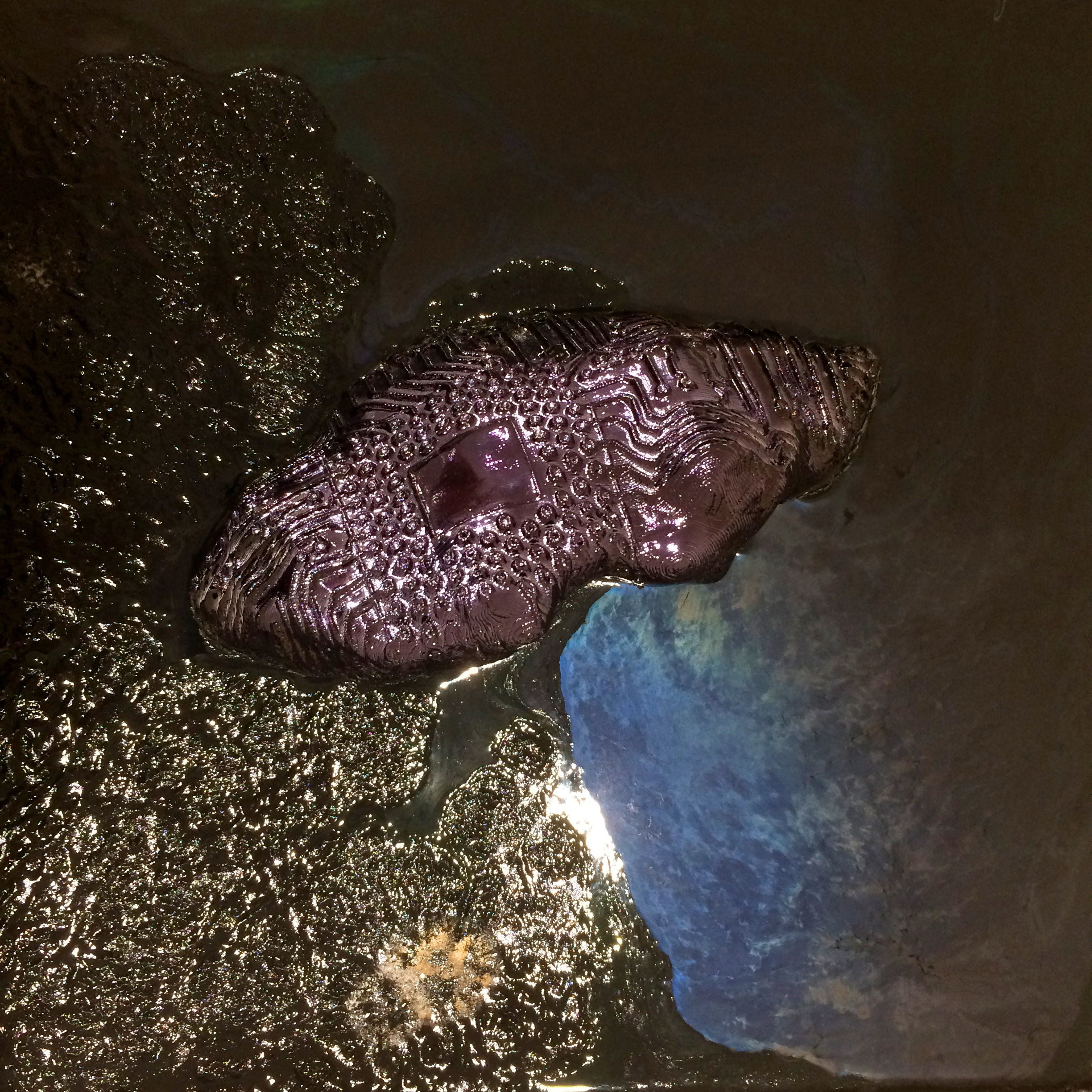 Object is placed into the dark liquid which leads my thinking towards the relations between the object and the environment. This functions as ‘’ a space inbetween’’ such as in Zen garden natural objects are surrounded by a very controlled symbolic landscape representing the concept of the Universe.